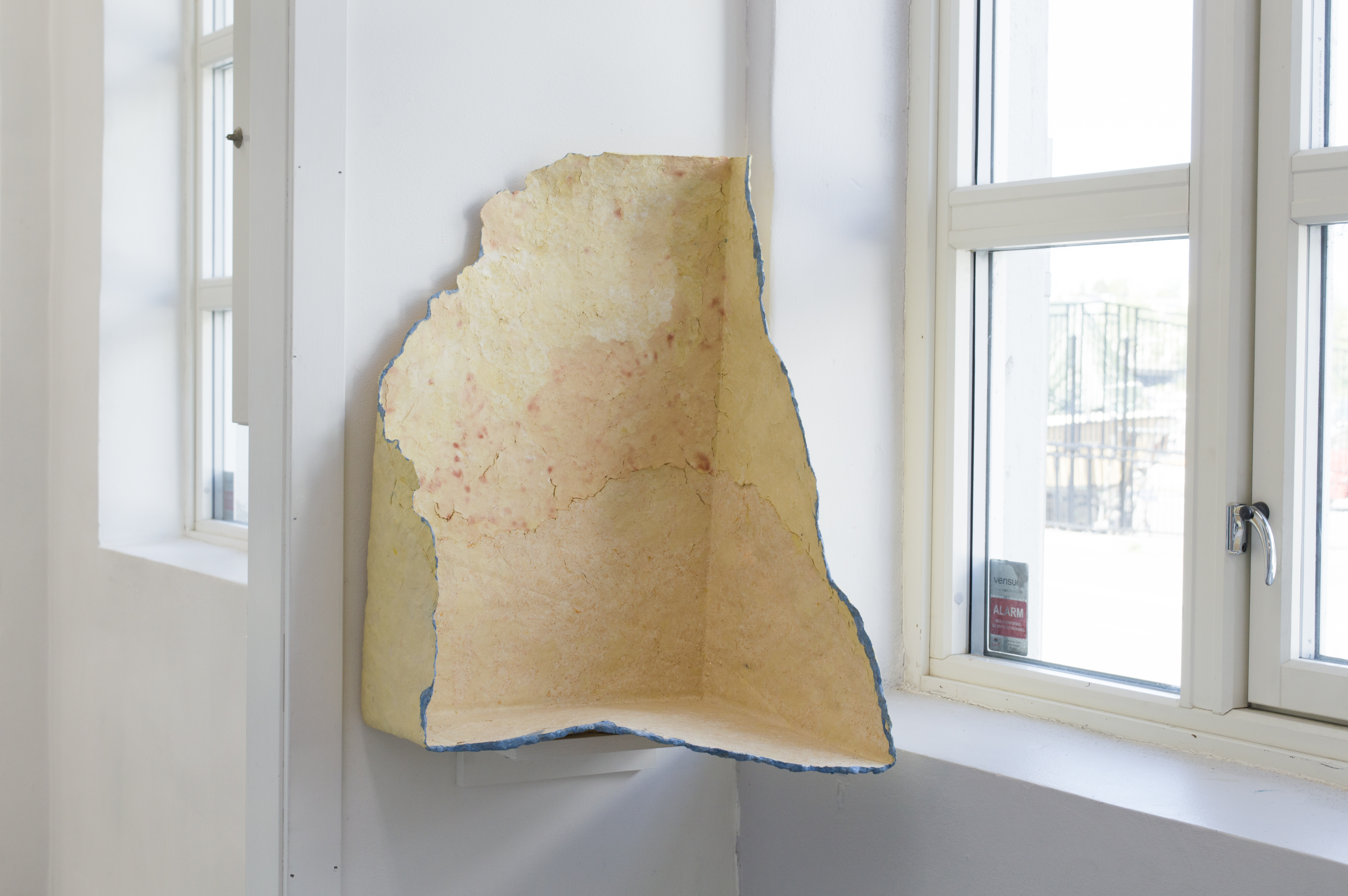 Paper pulp, pigments, acrylic paint, wall filler, tapestry glue